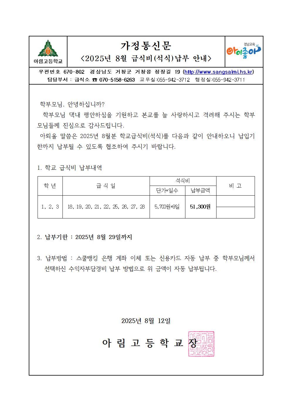 2025년 8월 학생 석식비 납부 안내 가정통신문
